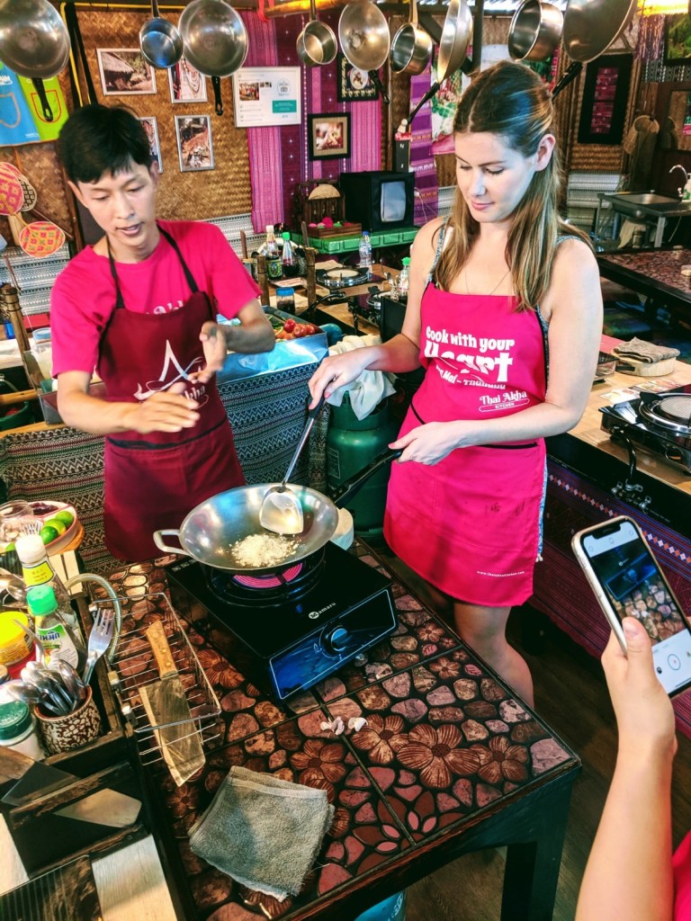 I couldn’t leave Thailand without signing up for a cooking class. I love to (attempt to) cook Thai curries and I needed to know if I have been doing it right, so I booked David and I in for a morning cooking class with Thai Akha cooking school. It was an amazing experience! The school is run by an Akha Hill Tribe woman (an ethnic minority group with villages scattered across parts of northern Thailand). There are only about 400,000 Akha people around the world and their food is not easy to find – and totally different to classic Thai food. We made 11 dishes – a mixture between classic Thai and Akha dishes.