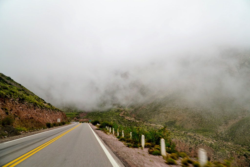 The next day started in the rain – we were so used to the great weather so far that it was totally unreasonable to expect rain in the wet season. Nonetheless we headed out to Salinas Grande (Great salt lake) to the East. The road was equally impressive – a 4000m high alpine pass winding its way up right up into the clouds.